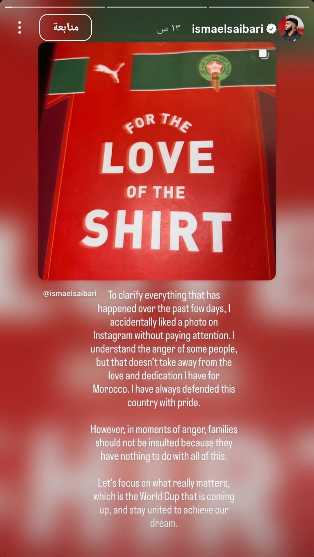 "أتفهم غضب البعض، لكن ذلك لا يقلل من حبي وتفانيّ تجاه المغرب، فقد دافعت دائمًا عن قميص المنتخب بكل فخر".