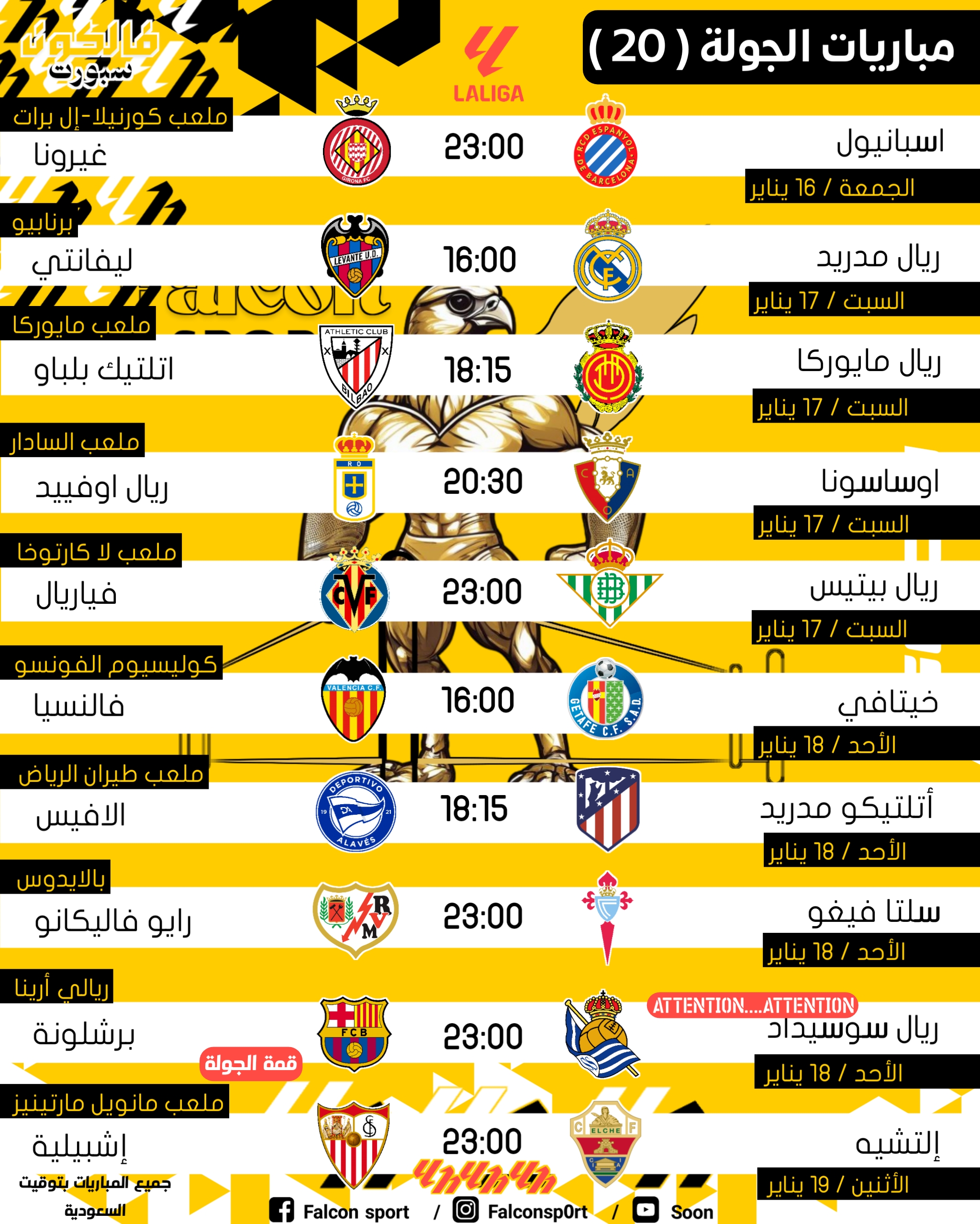 جدول مباريات الجولة ٢٠ من الدوري الاسباني